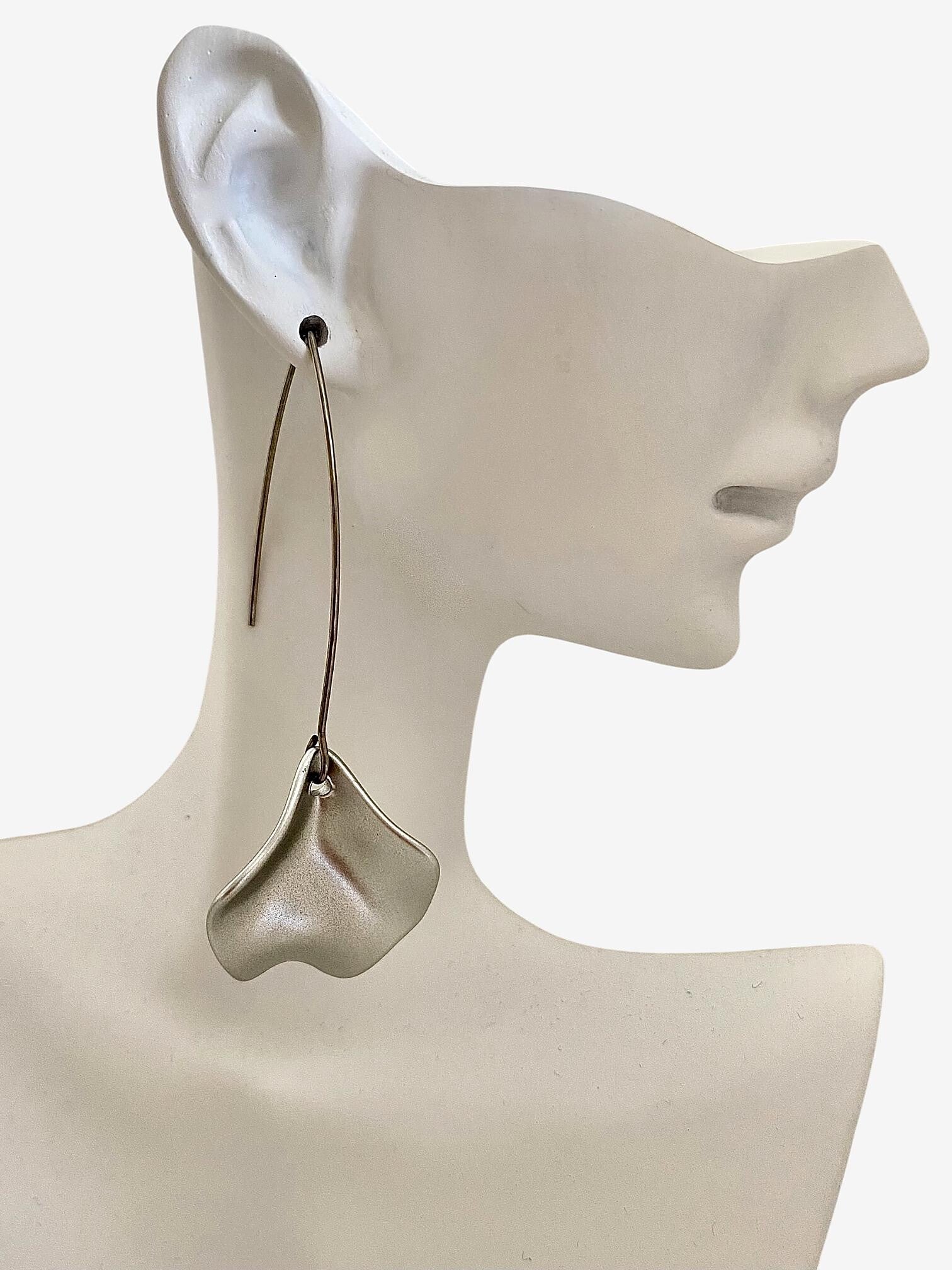 Modernes et graphiques, ces boucles d’oreilles associent un pétale en acrylique à une structure en acier inoxydable.